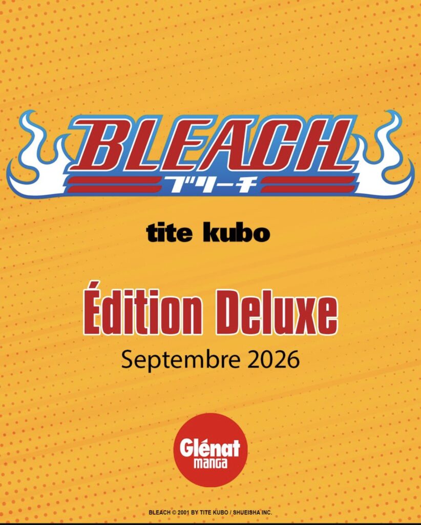 Cette fois-ci côté manga, Glénat Manga a annonce pour la France l’Édition Deluxe du manga de Tite Kubo pour septembre 2026. Les éditions deluxe sont appelés au Japon; Kanzenban. Ce format est plus grand que les tomes de base. Avec des page couleurs pour les illustrations colorés telles qu’elles sont apparues dans le Weekly Shônen Jump. Avec un papier de meilleur qualité et certaines pages retravaillées. Tout ça dans moins de tomes, car un Kanzenban peut contenir plusieurs Tankôbon !