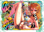 Page couleur : Une Nami géant (qui prend presque toute la double page) et des petits Mugiwaras qui l’entourent mangent de la nourriture d’été comme des glaces, des parfaits, des pastèques, ananas…)